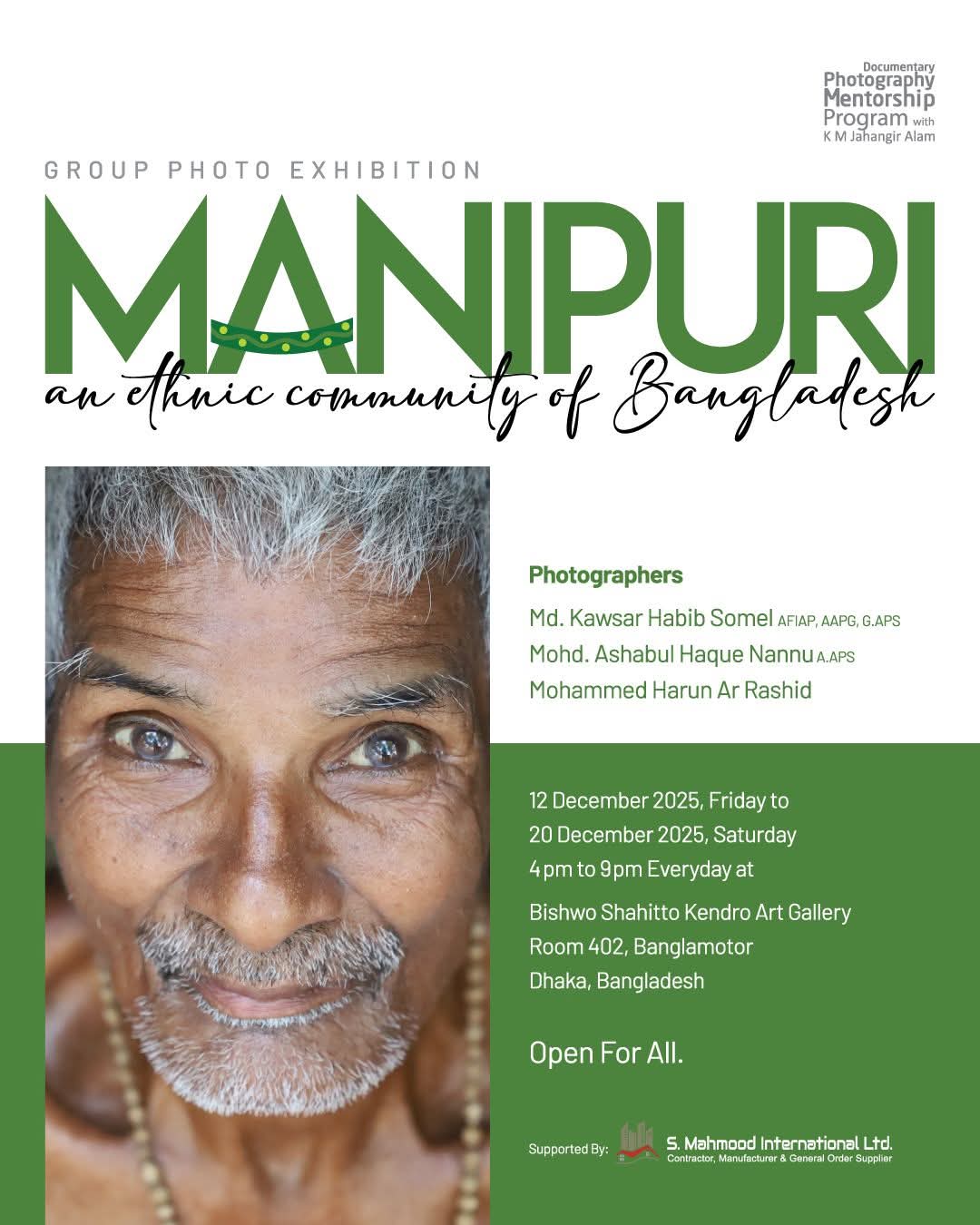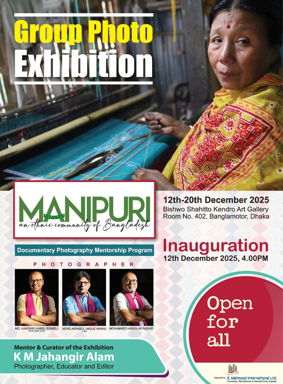 বাংলাদেশের উত্তর-পূর্বাঞ্চলের গুরুত্বপূর্ণ নৃতাত্ত্বিক সম্প্রদায় মণিপুরীর দৈনন্দিন জীবন, ভাষা, ধর্মবিশ্বাস, নৃত্য-সঙ্গীত ও কারুশিল্পকে কেন্দ্র করে একটি আলোকচিত্র প্রদর্শনী অনুষ্ঠিত হতে যাচ্ছে।