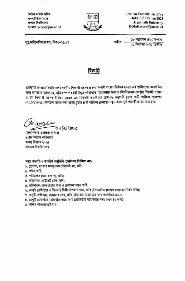 বিজ্ঞপ্তিতে বলা হয়, ভূমিকম্প পরবর্তী উদ্ভূত পরিস্থিতি বিবেচনায় জগন্নাথ বিশ্ববিদ্যালয় কেন্দ্রীয় শিক্ষার্থী সংসদ ও হল শিক্ষার্থী সংসদ নির্বাচন ২০২৫ এর নির্বাচনী তফসিলের ক্রম-১২ অনুযায়ী চূড়ান্ত প্রার্থী তালিকা প্রকাশের ৩ ডিসেম্বর (বুধবার) এর কার্যক্রম স্থগিত করা হলো। চূড়ান্ত প্রার্থী তালিকা প্রকাশের নতুন সময়-সূচি পরবর্তীতে জানানো হবে।