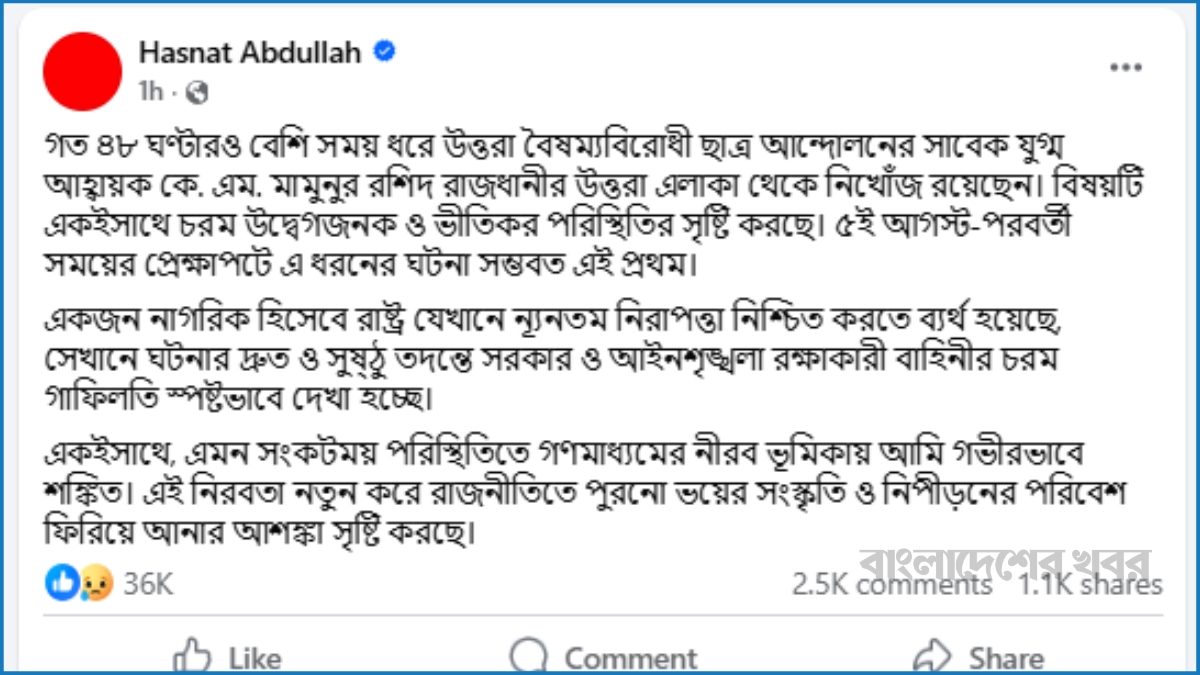 জাতীয় নাগরিক পার্টির (এনসিপি) দক্ষিণাঞ্চলের মুখ্য সংগঠক হাসনাত আব্দুল্লাহ বৃহস্পতিবার সকালে নিজের ভেরিফায়েড ফেসবুক পেজে এক স্ট্যাটাসে এ খবর জানিয়েছেন।