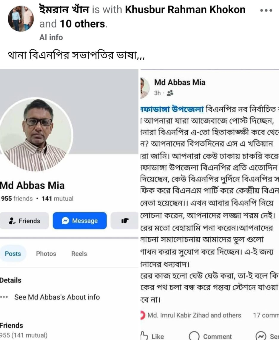আব্বাস মিয়া তার ফেসবুকে লিখেছেন, ‘আলফাডাঙ্গা উপজেলা বিএনপির নব নির্বাচিত কমিটি নিয়ে আপনারা যারা আজেবাজে পোস্ট দিচ্ছেন, আপনারা বিএনপির এ-তো হিতাকাঙ্ক্ষী কবে থেকে হলেন? আপনাদের বিগত দিনের এসএ খতিয়ান আমরা জানি। আপনারা কেউ ঢাকায় চাকরি করেন— আলফাডাঙ্গা উপজেলা বিএনপির প্রতি এতোদিন কি শ্রম দিয়েছেন? কেউ বিএনপির দুর্দিনে বিএনপির সাথে মুনাফিকি করে বিএনএম পার্টি করে কেন্দ্রীয় বিএনএম-এর নেতা হয়েছেন। এখন আবার বিএনপি নিয়ে সমালোচনা করেন— আপনাদের লজ্জা শরম নেই। কুকুরের মতো বেহায়ামি পনা করেন। আপনাদের আলোচনা সমালোচনায় আমাদের ভুলগুলো সংশোধন করার সুযোগ করে দিচ্ছেন। এই জন্য আপনাদের ধন্যবাদ।