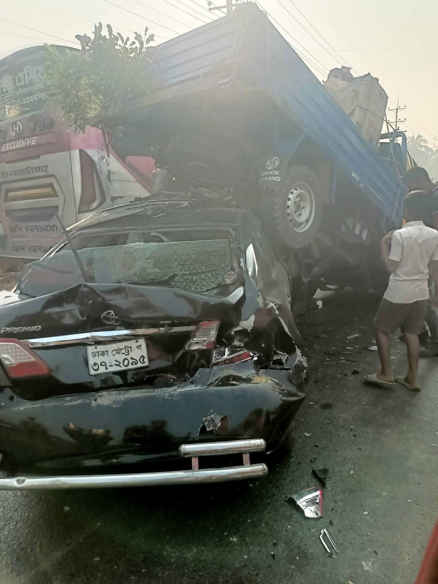 গাজীপুরের শ্রীপুরে ঢাকা-ময়মনসিংহ মহাসড়কে দ্রুতগতির একটি পিকআপ নিয়ন্ত্রণ হারিয়ে চলন্ত একটি প্রাইভেটকারের ওপর উঠে যায়।
