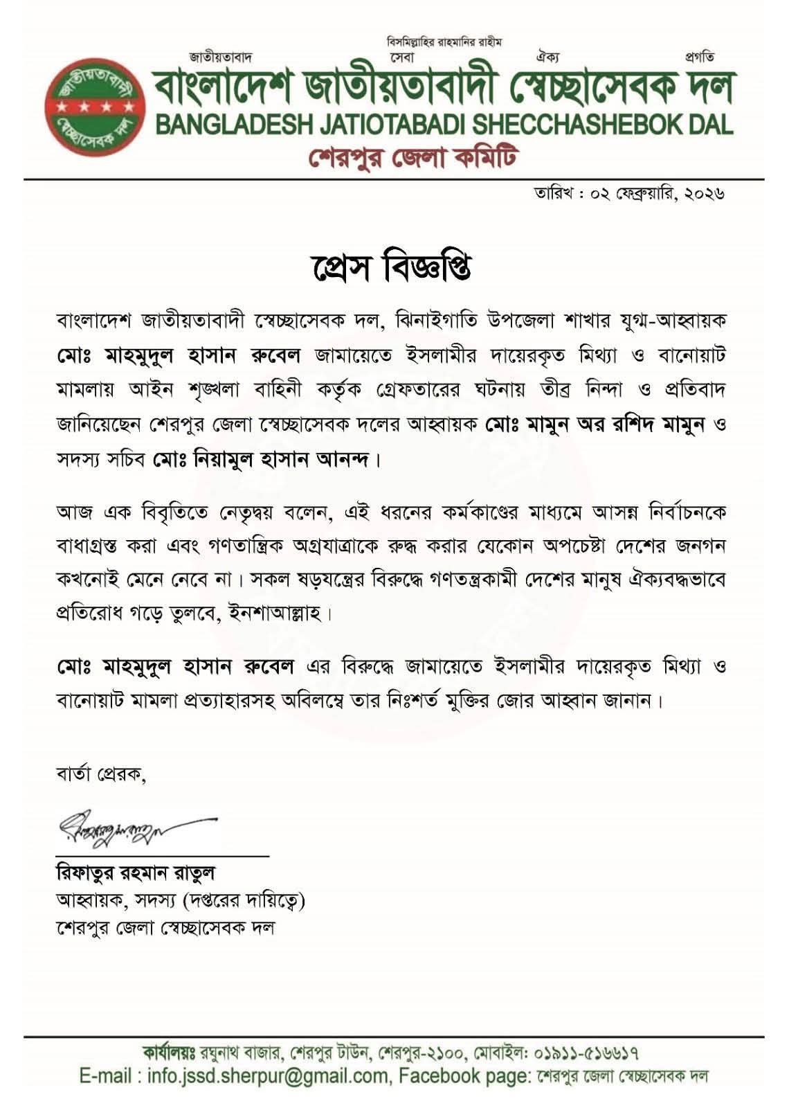 এদিকে, মাহমুদুল হাসান রুবেলকে গ্রেপ্তারের ঘটনায় তীব্র নিন্দা ও প্রতিবাদ জানিয়েছে শেরপুর জেলা স্বেচ্ছাসেবক দল।