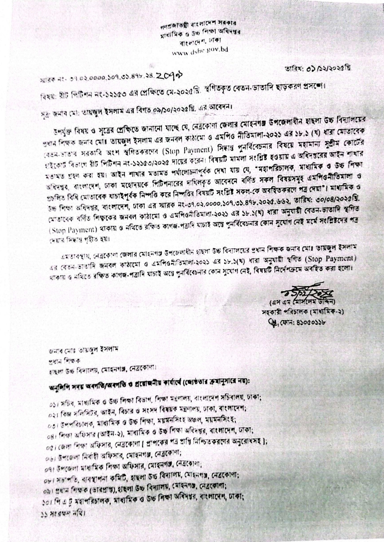 মাউশি সূত্র জানায়, গত ৩০ এপ্রিল ২০২৫ তারিখে এক স্মারক মূলে তায়জুল ইসলামের বেতন-ভাতাদি ‘স্টপ পেমেন্ট’ বা স্থগিত করা হয়। এই সিদ্ধান্ত পুনর্বিবেচনার জন্য তিনি মহামান্য সুপ্রিম কোর্টের হাইকোর্ট বিভাগে একটি রিট পিটিশন (নং- ১২১৫৩/২০২৫) দায়ের করেছিলেন।