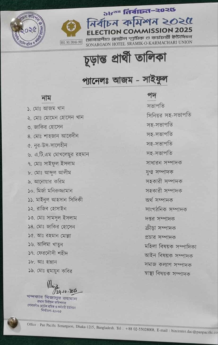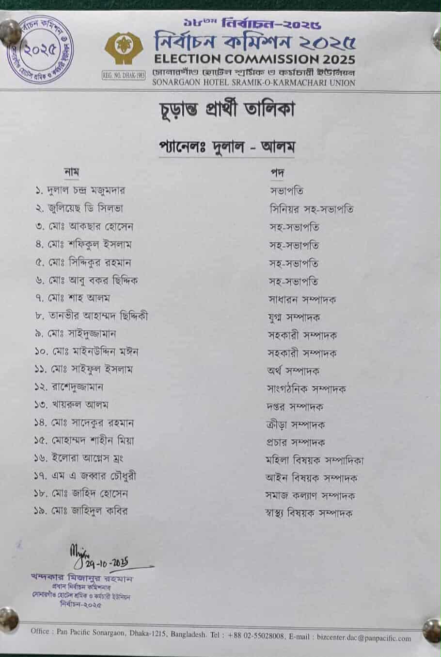 সোনারগাঁও হোটেল শ্রমিক ইউনিয়নের নির্বাচনে দুই প্যানেলের প্রার্থী ঘোষণা