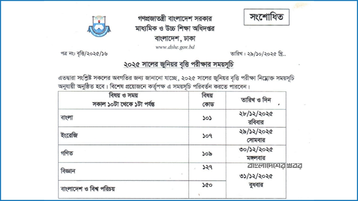 অষ্টম শ্রেণির জুনিয়র বৃত্তি পরীক্ষা এক সপ্তাহ পিছিয়েছে। নতুন সময়সূচি অনুযায়ী, আগামী ২৮ ডিসেম্বর থেকে এ পরীক্ষা শুরু হয়ে চলবে ৩১ ডিসেম্বর পর্যন্ত। বুধবার (২৯ অক্টোবর) ঢাকা মাধ্যমিক ও উচ্চমাধ্যমিক শিক্ষা বোর্ড সংশোধিত সময়সূচি প্রকাশ করেছে।