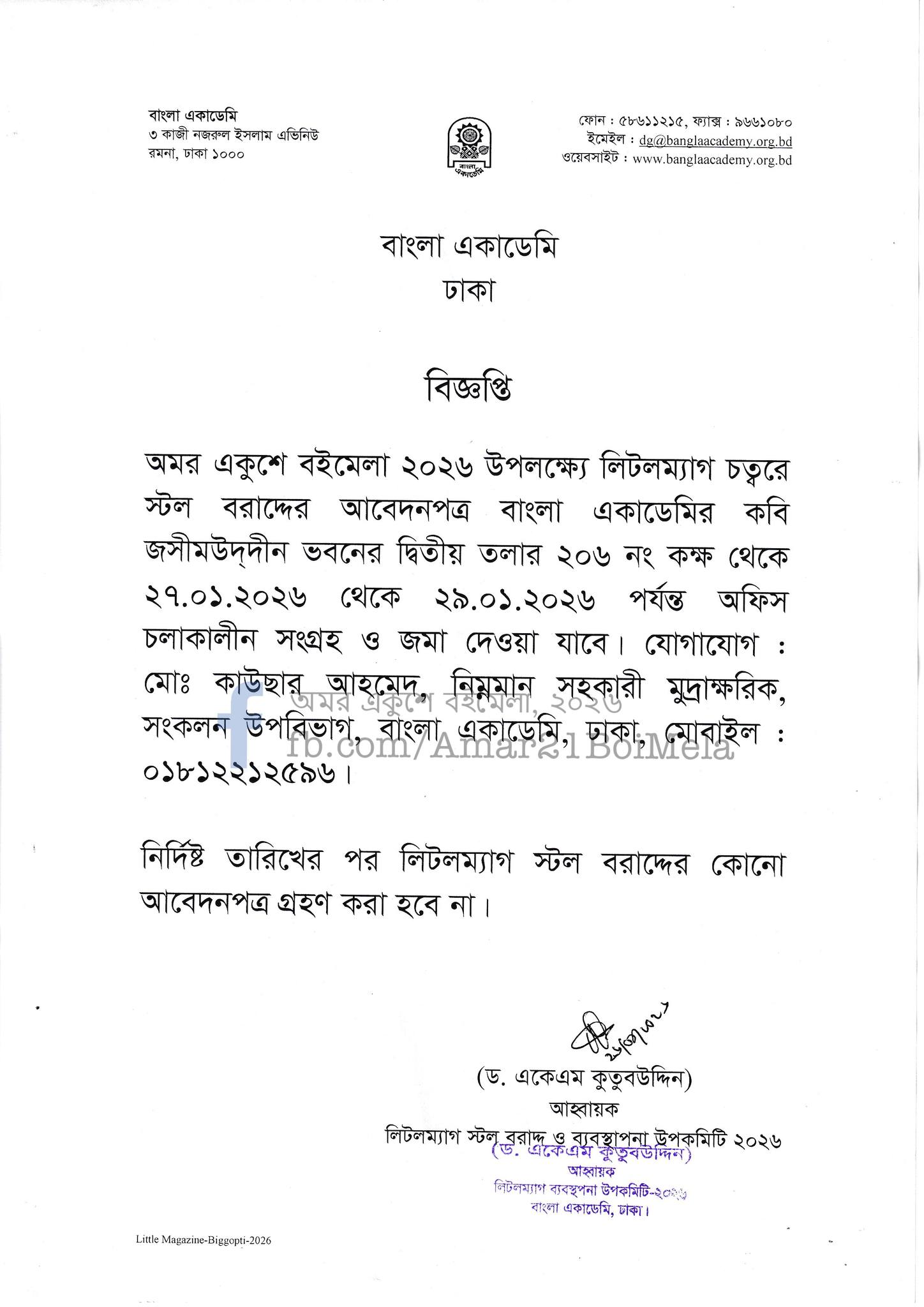 অমর একুশে বইমেলা-২০২৬ উপলক্ষে লিটলম্যাগ চত্বরে স্টল বরাদ্দের আবেদনপত্র সংগ্রহ ও জমা দেওয়ার কার্যক্রম শুরু হয়েছে। আজ মঙ্গলবার (২৭ জানুয়ারি) থেকে শুরু হওয়া এই প্রক্রিয়া চলবে আগামী ২৯ জানুয়ারি পর্যন্ত।