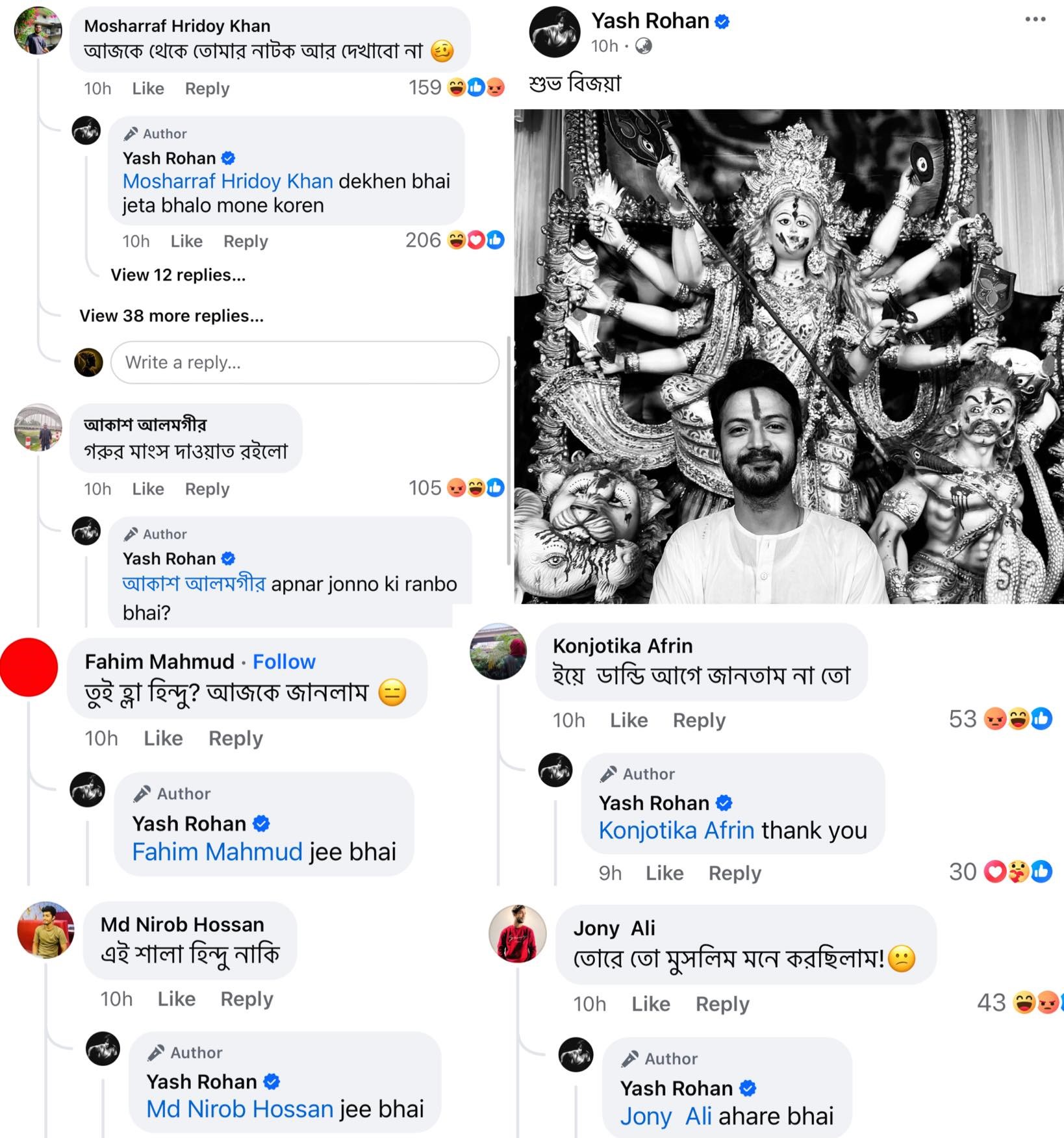 আবু হানিফ নামের একজন লিখেছেন, ‘ভাই আপনার নাটক অনেক দেখেছি। আজ থেকে দেখা হবে কিনা জানি না। কারণ ভাবছিলাম মুসলিম। আর নাটকগুলো ভালোই লাগত।’ ইয়াশ এই মন্তব্যের উত্তরে বলেছেন, ‘দেখেন যেটা ভালো মনে করেন।’