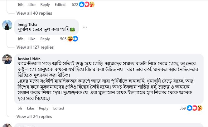 জসিম উদ্দীন নামের একজন মন্তব্য করেন, ‘কমেন্টগুলো পড়ে সত্যিই স্তব্ধ হয়ে গেছি। আমাদের সমাজ কতটা নিচে নেমে গেছে তা ভেবে কষ্ট হয়। মানুষকে ধর্ম দিয়ে নয়, কর্ম আর মানবতার ভিত্তিতে বিচার করা উচিত।’