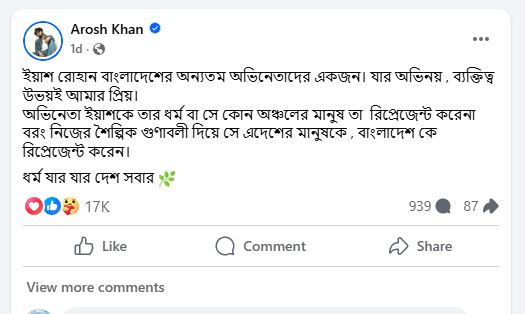 আরশ খান লিখেছেন, ‘ইয়াশ রোহান বাংলাদেশের অন্যতম অভিনেতাদের একজন। যার অভিনয়, ব্যক্তিত্ব উভয়ই আমার প্রিয়। অভিনেতা ইয়াশকে তার ধর্ম বা সে কোন অঞ্চলের মানুষ তা রিপ্রেজেন্ট করে না বরং নিজের শৈল্পিক গুণাবলী দিয়ে সে এদেশের মানুষকে, বাংলাদেশকে রিপ্রেজেন্ট করেন। ধর্ম যার যার দেশ সবার।’