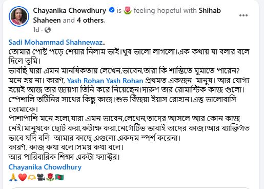 চয়নিকা চৌধুরী লিখেছেন, ‘ভাবছি যারা এমন মানসিকতায় লেখেন, ভাবেন, তারা কি শান্তিতে ঘুমাতে পারেন? মনে হয় না। কারণ, ইয়াশ রোহান প্রথমত একজন মানুষ। আর যোগ্য হয়েই আজ তার জায়গা তিনি করে নিয়েছেন। দারুণ তার রোমান্টিক কাজগুলো। স্পেশালি তটিনির সাথের কিছু কাজ। শুভ বিঁজয়া ইয়াশ রোহান। এত্ত ভালোবাসি তোমাকে। পাশাপাশি মনে হলো, যারা এমন ভাবেন, লেখেন, তাদের আসলে আর কোন কাজ নেই। মানুষকে ছোট করা, কটাক্ষ করা, নেগেটিভ ভাবাই তাদের কাজ। আর ব্যাক্তিগতভাবে যদি বলি আমার কাছে এগুলো একদম স্পর্শ করে না। কারণ, কাজ কথা বলে। সময় কথা বলে। আর পারিবারিক শিক্ষা একটা ফ্যাক্টর।’