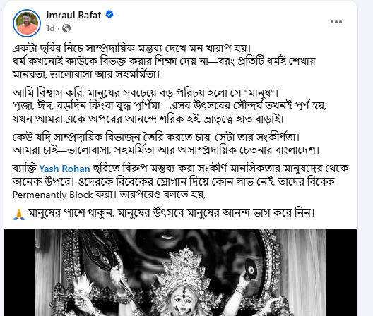 নাট্য নির্মাতা ইমরাউল রাফাত লিখেছেন, ‘একটা ছবির নিচে সাম্প্রদায়িক মন্তব্য দেখে মন খারাপ হয়। ধর্ম কখনোই কাউকে বিভক্ত করার শিক্ষা দেয় না— বরং প্রতিটি ধর্মই শেখায় মানবতা, ভালোবাসা আর সহমর্মিতা। আমি বিশ্বাস করি, মানুষের সবচেয়ে বড় পরিচয় হলো সে ‘মানুষ’। পূজা, ঈদ, বড়দিন কিংবা বুদ্ধ পূর্ণিমা— এসব উৎসবের সৌন্দর্য তখনই পূর্ণ হয়, যখন আমরা একে অপরের আনন্দে শরিক হই, ভ্রাতৃত্বে হাত বাড়াই। কেউ যদি সাম্প্রদায়িক বিভাজন তৈরি করতে চায়, সেটা তার সংকীর্ণতা। আমরা চাই— ভালোবাসা, সহমর্মিতা আর অসাম্প্রদায়িক চেতনার বাংলাদেশ। ব্যক্তি ইয়াশ রোহান- ছবিতে বিরুপ মন্তব্য করা সংকীর্ণ মানসিকতার মানুষদের থেকে অনেক উপরে। ওদেরকে বিবেকের স্লোগান দিয়ে কোন লাভ নেই, তাদের বিবেক Permenantly Block করা। তারপরেও বলতে হয়, মানুষের পাশে থাকুন, মানুষের উৎসবে মানুষের আনন্দ ভাগ করে নিন।’
