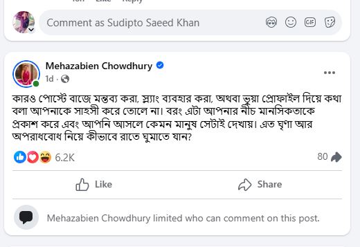 জনপ্রিয় অভিনেত্রী মেহজাবীন চৌধুরী তার পোস্টে বলেন, ‘কারও পোস্টে বাজে মন্তব্য করা, স্ল্যাং ব্যবহার করা, অথবা ভুয়া প্রোফাইল দিয়ে কথা বলা আপনাকে সাহসী করে তোলে না। বরং এটা আপনার নীচ মানসিকতাকে প্রকাশ করে এবং আপনি আসলে কেমন মানুষ সেটাই দেখায়। এত ঘৃণা আর অপরাধবোধ নিয়ে কীভাবে রাতে ঘুমাতে যান?’