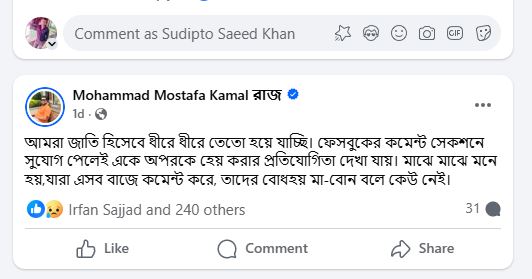 নির্মাতা মোস্তফা কামাল রাজ লিখেছেন, ‘আমরা জাতি হিসেবে ধীরে ধীরে তেতো হয়ে যাচ্ছি। ফেসবুকের কমেন্ট সেকশনে সুযোগ পেলেই একে অপরকে হেয় করার প্রতিযোগিতা দেখা যায়। মাঝে মাঝে মনে হয়, যারা এসব বাজে কমেন্ট করে, তাদের বোধহয় মা-বোন বলে কেউ নেই।’