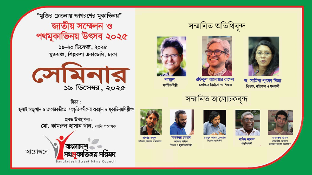 দুই দিনব্যাপী আয়োজনে দুটি সেমিনার অনুষ্ঠিত হবে। প্রথম সেমিনারে মো. কামরুল হাসান খান উপস্থাপন করবেন ‘জুলাই অভ্যুত্থান: তৎপরবর্তীতে সংস্কৃতিকর্মী ও মূকাভিনয়শিল্পীগণ’ শীর্ষক প্রবন্ধ। দ্বিতীয় সেমিনারে আসবাবীর রাফসান উপস্থাপন করবেন ‘পথমূকাভিনয়ের সম্ভাবনা’ বিষয়ক প্রবন্ধ।