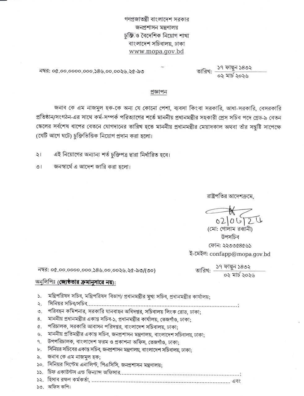 প্রজ্ঞাপনে বলা হয়েছে, কে এম নাজমুল হককে অন্য যেকোনো পেশা, ব্যবসা কিংবা সরকারি, আধা-সরকারি, বেসরকারি প্রতিষ্ঠান/সংগঠনের সঙ্গে কর্ম-সম্পর্ক পরিত্যাগের শর্তে প্রধানমন্ত্রীর সহকারী প্রেস সচিব পদে গ্রেড-৯ বেতন স্কেলের সর্বশেষ ধাপের বেতনে যোগদানের তারিখ হতে তার মেয়াদকাল অথবা তার সন্তুষ্টি সাপেক্ষে (যেটি আগে ঘটে) চুক্তিভিত্তিক নিয়োগ দেওয়া হলো।