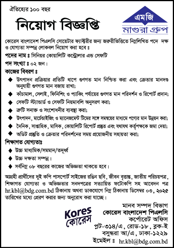 কোরেস বাংলাদেশে সিনিয়র কোয়ালিটি কন্ট্রোলার এন্ড সেফটি পদে নিয়োগ