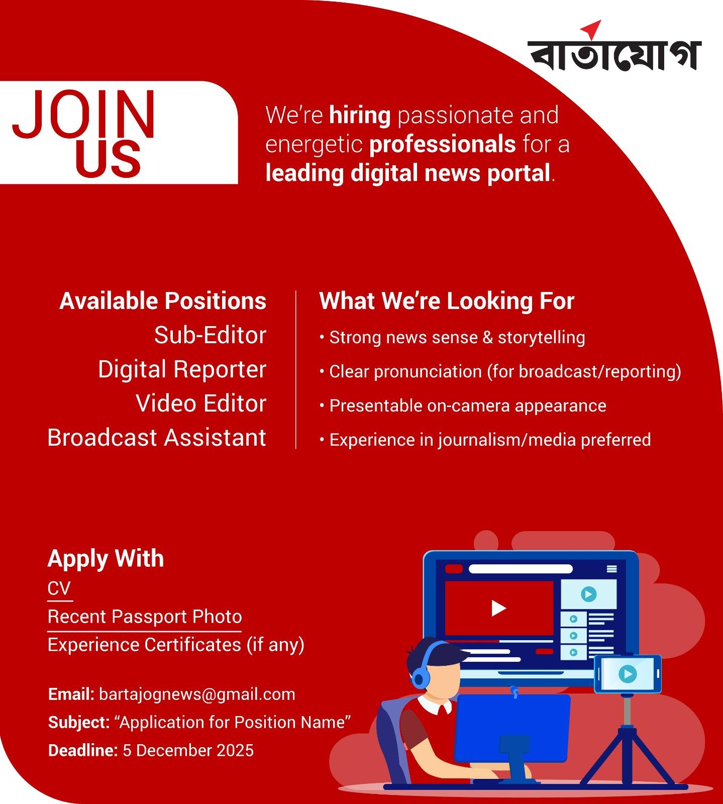 নিয়োগ দিচ্ছে অনলাইনভিত্তিক ডিজিটাল নিউজ পোর্টাল ‘বার্তাযোগ’। প্রতিষ্ঠানটি সাব–এডিটর, ডিজিটাল রিপোর্টার, ভিডিও এডিটর এবং ব্রডকাস্ট অ্যাসিস্ট্যান্ট পদে যোগ্য প্রার্থীদের আবেদন আহ্বান করেছে।