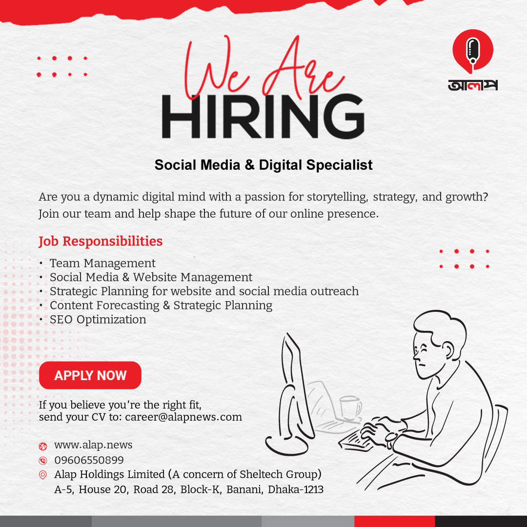 অনলাইন প্ল্যাটফর্ম পরিচালনা, কনটেন্ট পরিকল্পনা ও ডিজিটাল কৌশলে দক্ষ? তাহলে আপনাকেই খুঁজছে বাংলা ভাষাভাষী দর্শক–শ্রোতাদের জন্য সাক্ষাৎকার, তথ্য, বিশ্লেষণ ও পডকাস্ট কনটেন্ট নিয়ে কাজ করা ডিজিটাল প্ল্যাটফর্ম ‘আলাপ নিউজ’।