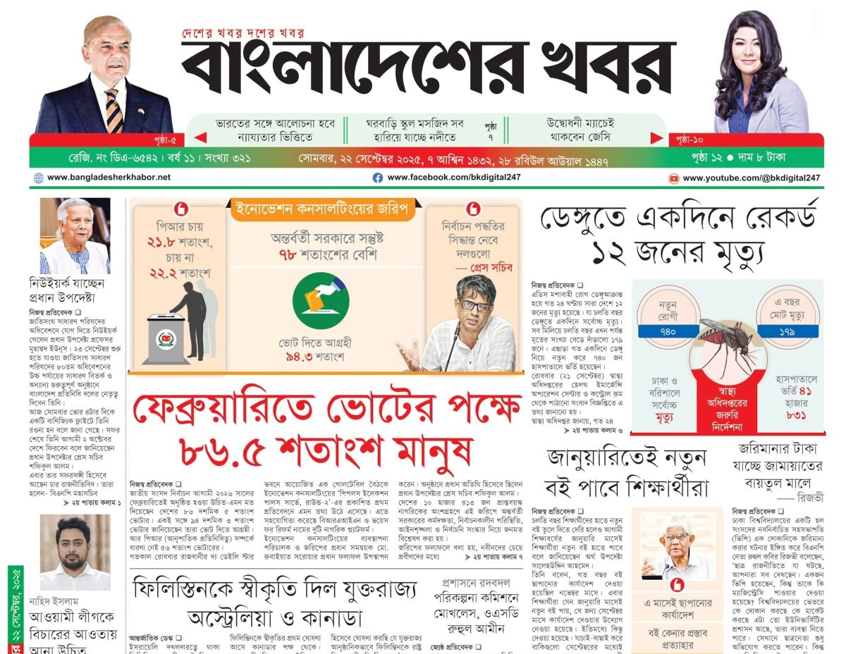 বাংলাদেশের খবর প্রধান শিরোনাম করেছে, ‘ফেব্রুয়ারিতে ভোটের পক্ষে ৮৬.৫ শতাংশ মানুষ’
