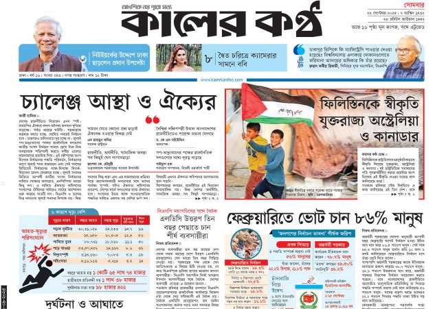 কালের কণ্ঠ প্রধান শিরোনাম করেছে, ‘চ্যালেঞ্জ আস্থা ও ঐক্যের’