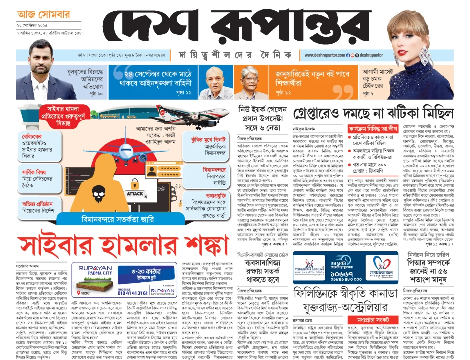দেশ রূপান্তর প্রধান শিরোনাম করেছে, ‘সাইবার হামলার শঙ্কা’