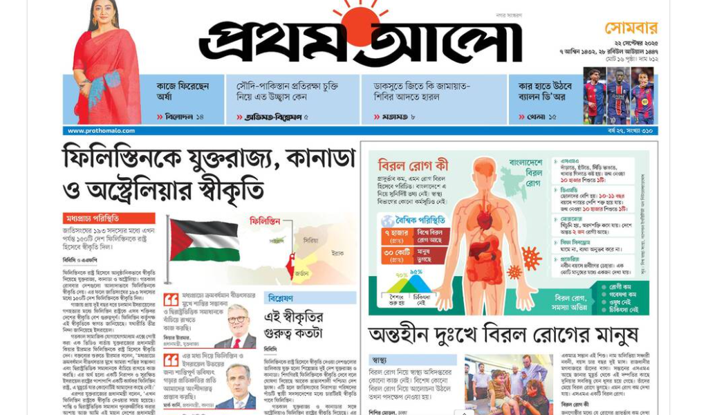 প্রথম আলো প্রধান শিরোনাম করেছে, ‘ফিলিস্তিনকে যুক্তরাজ্য, কানাডা ও অস্ট্রেলিয়ার স্বীকৃতি’