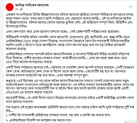 ফয়েজ আহমদ তৈয়্যব লেখেন, আরেকটি বিষয়-যে কেউ বিদেশ ভ্রমণে নিজের ব্যবহারের ফোনের বাইরে একটি অতিরিক্ত মোবাইল ফোন সাথে আনতে পারবেন। গত সপ্তাহে এই চক্রের কয়েকজন প্রতিনিধি আমার সাথে দেখা করতে চাইলে আমি খুবই স্পষ্টভাবে দুটি শর্ত দিই-দেশীয় উৎপাদনকারী প্রতিষ্ঠানের শোরুমে হামলা, বন্ধ করা ও হুমকি বন্ধ করতে হবে। এনইআইআর বিরোধী সব কার্যক্রম বন্ধ করতে হবে। তারা যদি এই দুই শর্ত মানে, তাহলে বৈধ ফোন আমদানির শুল্ক কমাতে এনবিআরকে চিঠি দেওয়ার বিষয়ে বিবেচনা করব। তারা এরপর আর যোগাযোগ করেনি।
