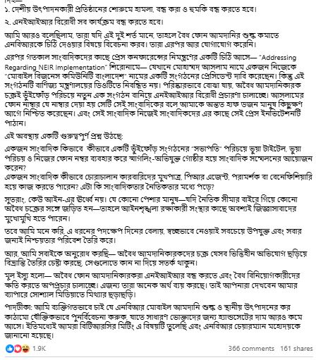 তিনি লেখেন, এরপর গতকাল সাংবাদিকদের কাছে প্রেস কনফারেন্সের নিমন্ত্রণের একটি চিঠি আসে- “Addressing Regarding NEIR Implementation” শিরোনামে- যেখানে মোহাম্মদ আসলাম নামে একজন নিজেকে “মোবাইল বিজনেস কমিউনিটি বাংলাদেশ” নামের একটি সংগঠনের প্রেসিডেন্ট দাবি করেছেন। কিন্তু এই সংগঠনটি বাণিজ্য মন্ত্রণালয়ের ডিওটিতে নিবন্ধিত নয়। পরিষ্কারভাবে বোঝা যায়, অবৈধ আমদানিকারক চক্রই ভুঁইফোঁড় পরিচয়ে নতুন এক সংগঠন বানিয়ে এনইআইআর বিরোধী প্রচারণা চালাচ্ছে। আসলামের ফোন নাম্বার যে নাম্বার দেয়া হয় সেটি সেই সাংবাদিকের বলে আমাকে অন্তত হাফ ডজন মানুষ কিছুক্ষণ আগে নিশ্চিত করেছেন। এবং সেই সাংবাদিক নিজেই সাংবাদিকদের এর কাছে সেই প্রেস ইনভিটেশনটি পাঠান।