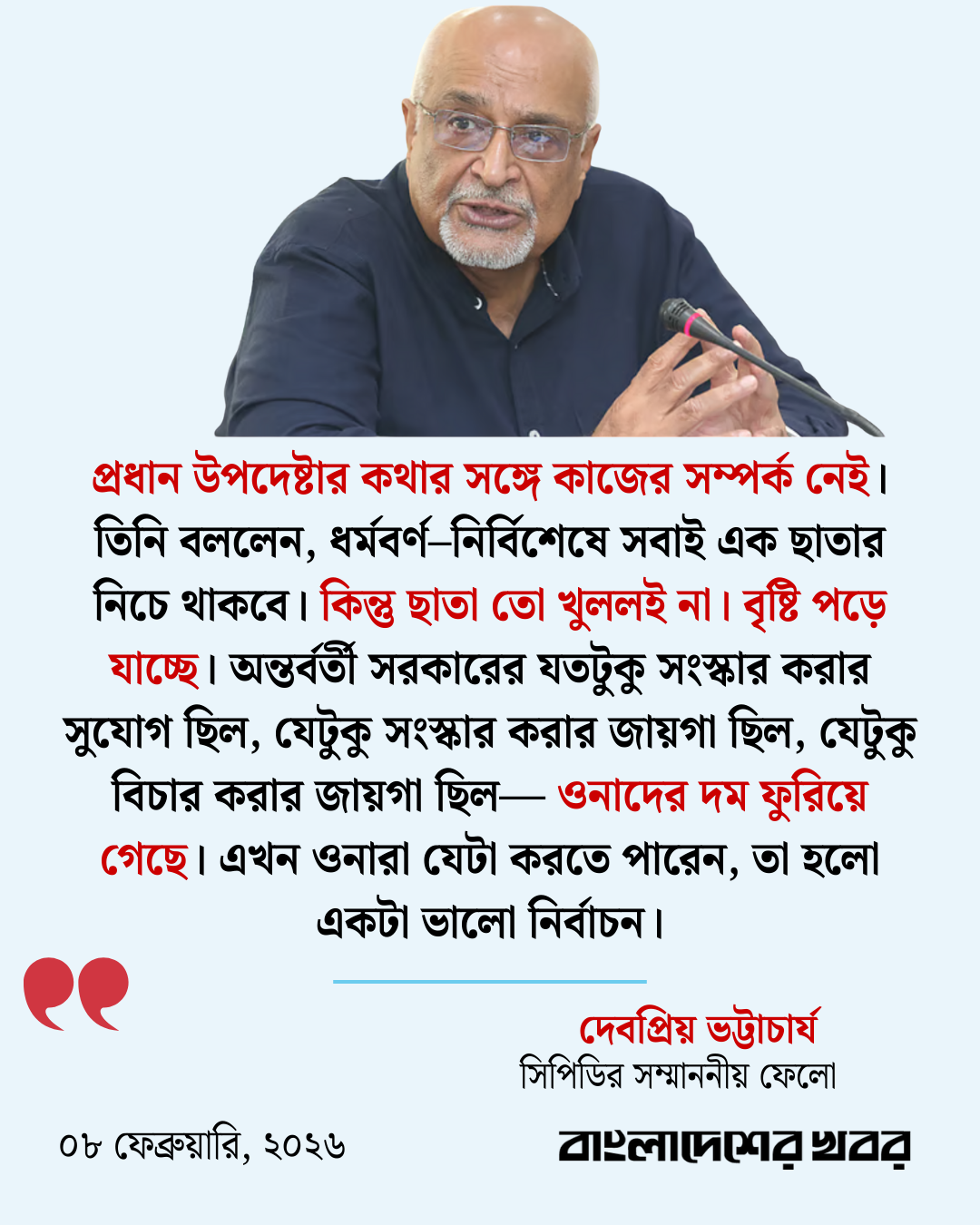 ফলাফল প্রকাশের পর আলোচনায় দেবপ্রিয় ভট্টাচার্য বলেন, ‘প্রধান উপদেষ্টার কথার সঙ্গে কাজের সম্পর্ক নেই। তিনি বললেন, ধর্মবর্ণ–নির্বিশেষে সবাই এক ছাতার নিচে থাকবে। কিন্তু ছাতা তো খুললই না। বৃষ্টি পড়ে যাচ্ছে।’