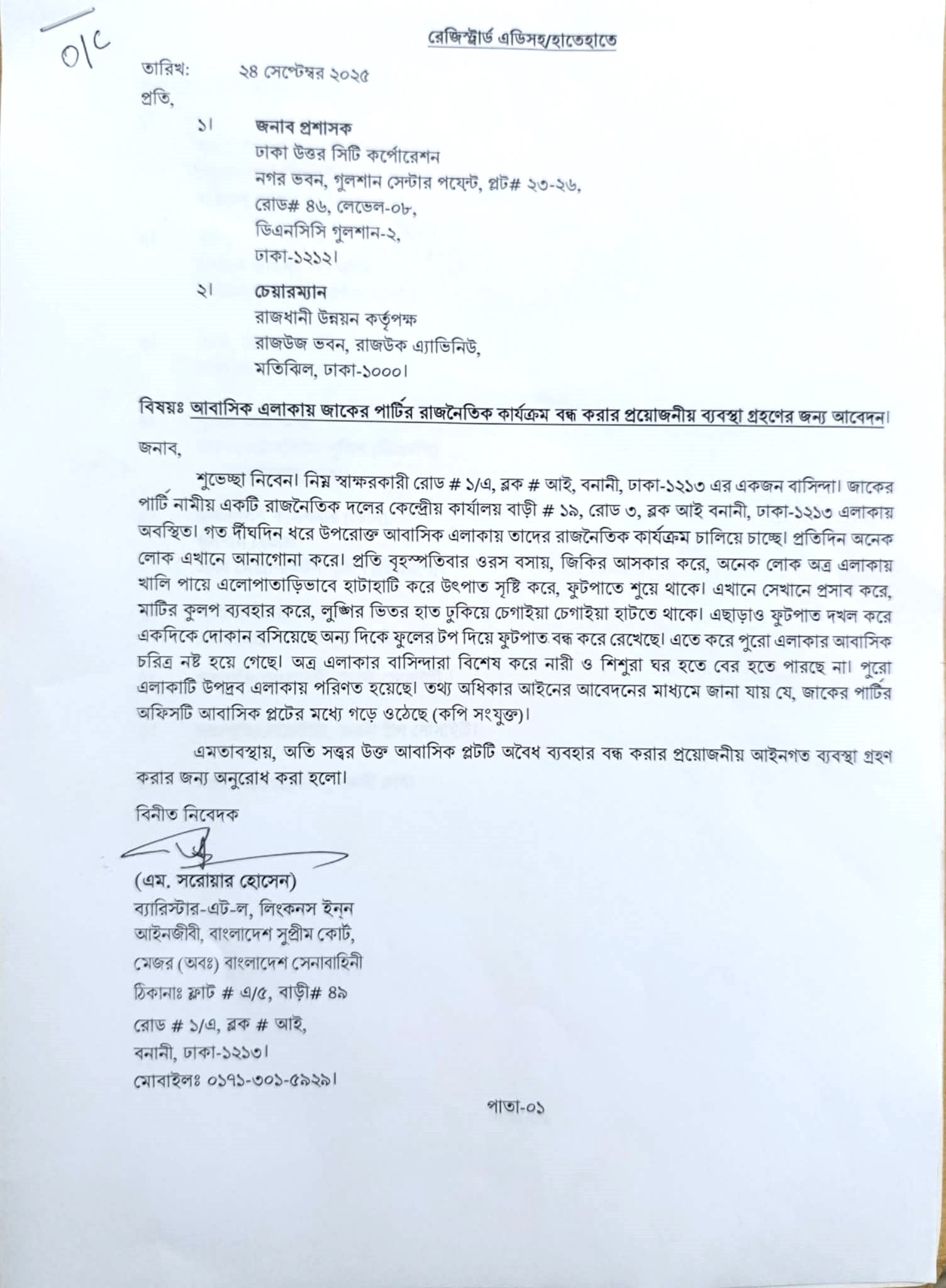 পুরো এলাকা উপদ্রবপূর্ণ হয়ে পড়েছে বলেও দাবি করেন তিনি। এছাড়া তথ্য অধিকার আইনের মাধ্যমে জানা গেছে, জাকের পার্টির কার্যালয়টি প্রকৃতপক্ষে একটি আবাসিক প্লটে পরিচালিত হচ্ছে, যা আইনগতভাবে সম্পূর্ণ অবৈধ এবং এর মাধ্যমে এলাকার আবাসিক চরিত্র ধ্বংস হচ্ছে। তিনি ডিএনসিসি ও রাজউকের প্রতি আহ্বান জানিয়েছেন, যেন অবিলম্বে আইনগত ব্যবস্থা নিয়ে আবাসিক প্লটটির অননুমোদিত ব্যবহার বন্ধ করা হয়।