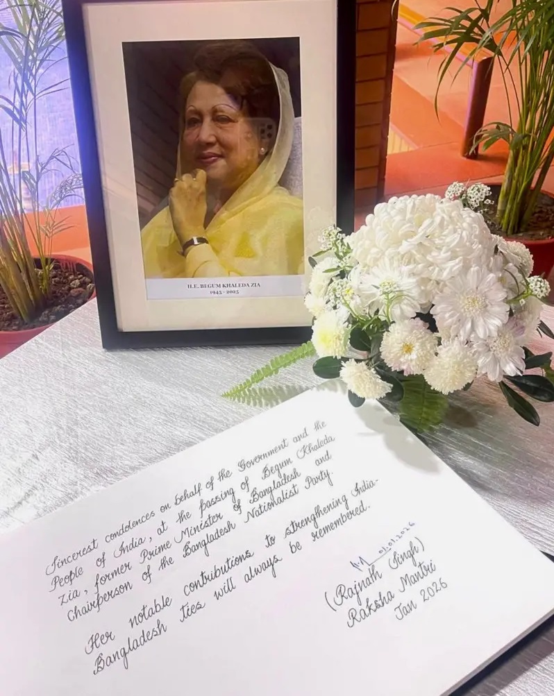 বৃহস্পতিবার (১ জানুয়ারি) দুপুরে দিল্লিতে অবস্থিত বাংলাদেশ হাইকমিশনে গিয়ে বেগম খালেদা জিয়ার প্রতি শেষ শ্রদ্ধা জানান রাজনাথ সিং। এ সময় বাংলাদেশ মিশনে সংরক্ষিত শোক বইতে তিনি গভীর শোক ও সমবেদনার বার্তা লেখেন।