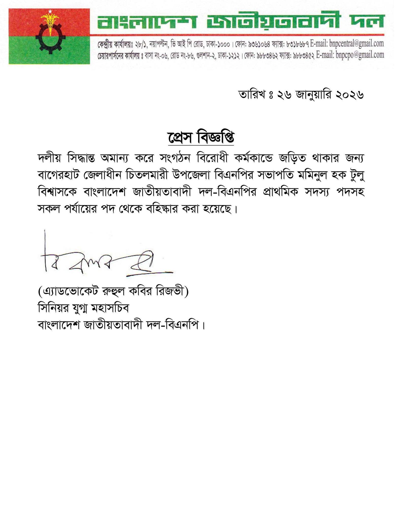 এর আগে সোমবার (২৬ জানুয়ারি) অন্য এক বিজ্ঞপ্তিতে জানানো হয়, দলীয় সিদ্ধান্ত অমান্য করায় বাগেরহাট জেলাধীন চিতলমারী উপজেলা বিএনপির সভাপতি মমিনুল হক টুলু বিশ্বাসকে দলের সকল পদ থেকে বহিষ্কার করা হয়েছে।