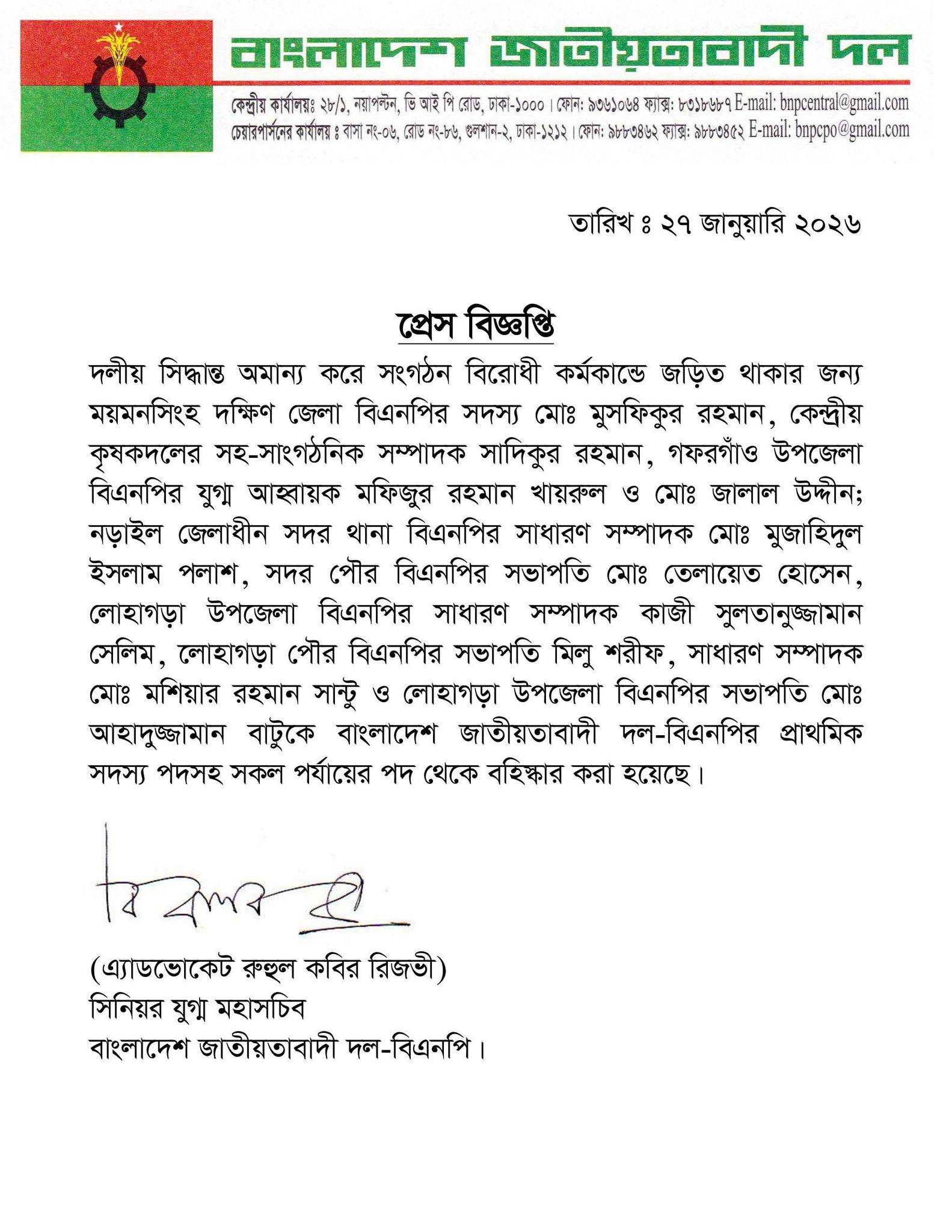 মঙ্গলবার (২৭ জানুয়ারি) প্রকাশিত বিজ্ঞপ্তিতে জানানো হয়, ময়মনসিংহ দক্ষিণ জেলা বিএনপির সদস্য মো. মুসফিকুর রহমান, কেন্দ্রীয় কৃষকদলের সহ-সাংগঠনিক সম্পাদক সাদিকুর রহমান, এবং গফরগাঁও উপজেলা বিএনপির দুই যুগ্ম আহ্বায়ক মফিজুর রহমান খায়রুল ও মোঃ জালাল উদ্দীনকে বহিষ্কার করা হয়েছে।