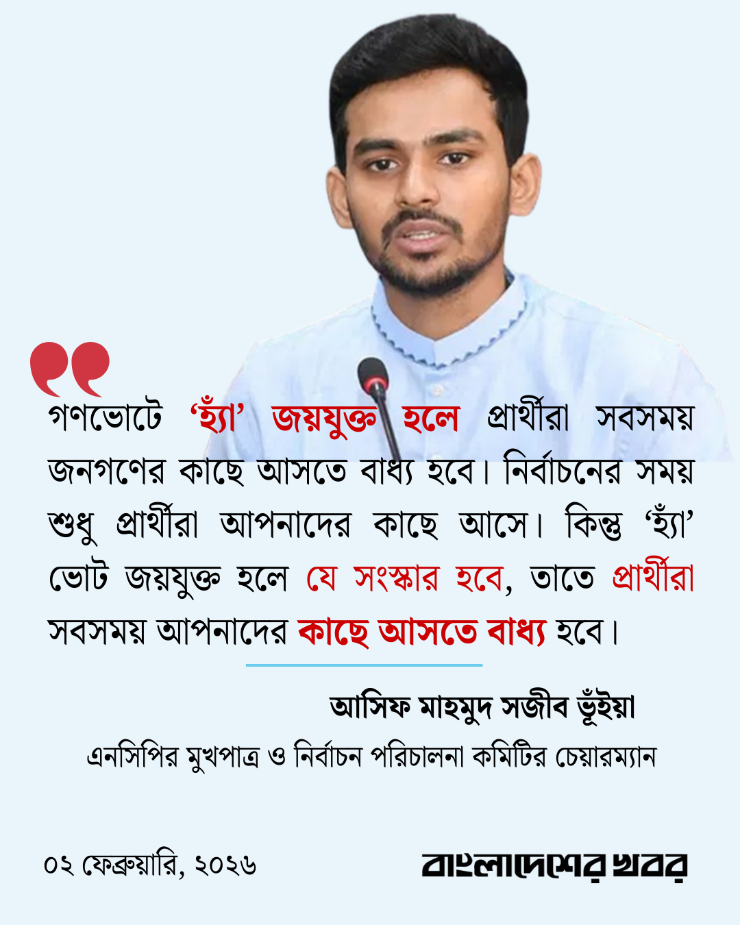 জাতীয় নাগরিক পার্টির (এনসিপি) মুখপাত্র ও নির্বাচন পরিচালনা কমিটির চেয়ারম্যান আসিফ মাহমুদ সজীব ভূঁইয়া বলেছেন, ‘‘গণভোটে ‘হ্যাঁ’ জয়যুক্ত হলে প্রার্থীরা সবসময় জনগণের কাছে আসতে বাধ্য হবে।’’
