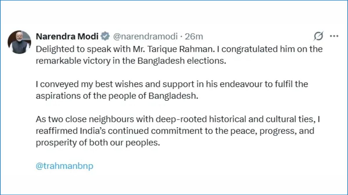 নরেন্দ্র মোদি তার পোস্টে জানান, তারেক রহমানের সঙ্গে কথা বলতে পেরে তিনি আনন্দিত। বাংলাদেশের নির্বাচনে উল্লেখযোগ্য বিজয়ের জন্য তিনি তাকে অভিনন্দন জানিয়েছেন এবং বাংলাদেশের জনগণের আশা-আকাঙ্ক্ষা পূরণে তারেক রহমানের প্রচেষ্টায় শুভকামনা ও সমর্থন ব্যক্ত করেছেন।
