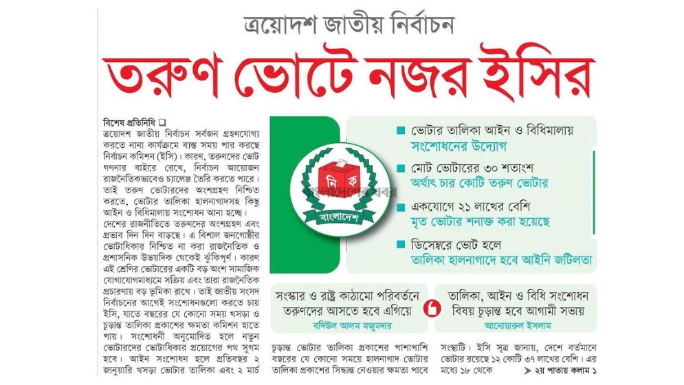 বাংলাদেশের খবরের প্রথম পাতায় বলা হয়েছে, ত্রয়োদশ জাতীয় নির্বাচন সর্বজন গ্রহণযোগ্য করতে নানা কার্যক্রমে ব্যস্ত সময় পার করছে নির্বাচন কমিশন (ইসি)। কারণ, তরুণদের ভোট গণনার বাইরে রেখে, নির্বাচন আয়োজন রাজনৈতিকভাবেও চ্যালেঞ্জ তৈরি করতে পারে।